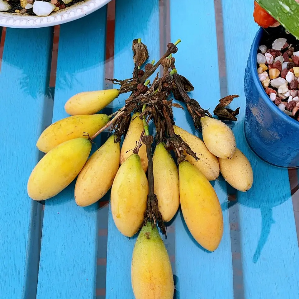 Banana passion fruit is spindle-shaped in shape, turns orange-yellow when ripe, and is very similar to a banana. There are sticky threads inside, and there is a black seed in each corner, and each seed is oval. 👇