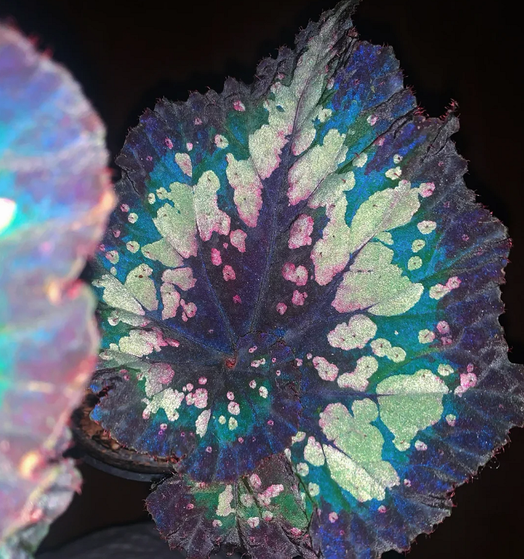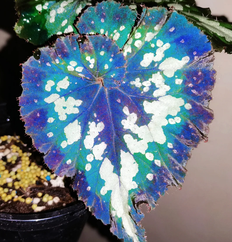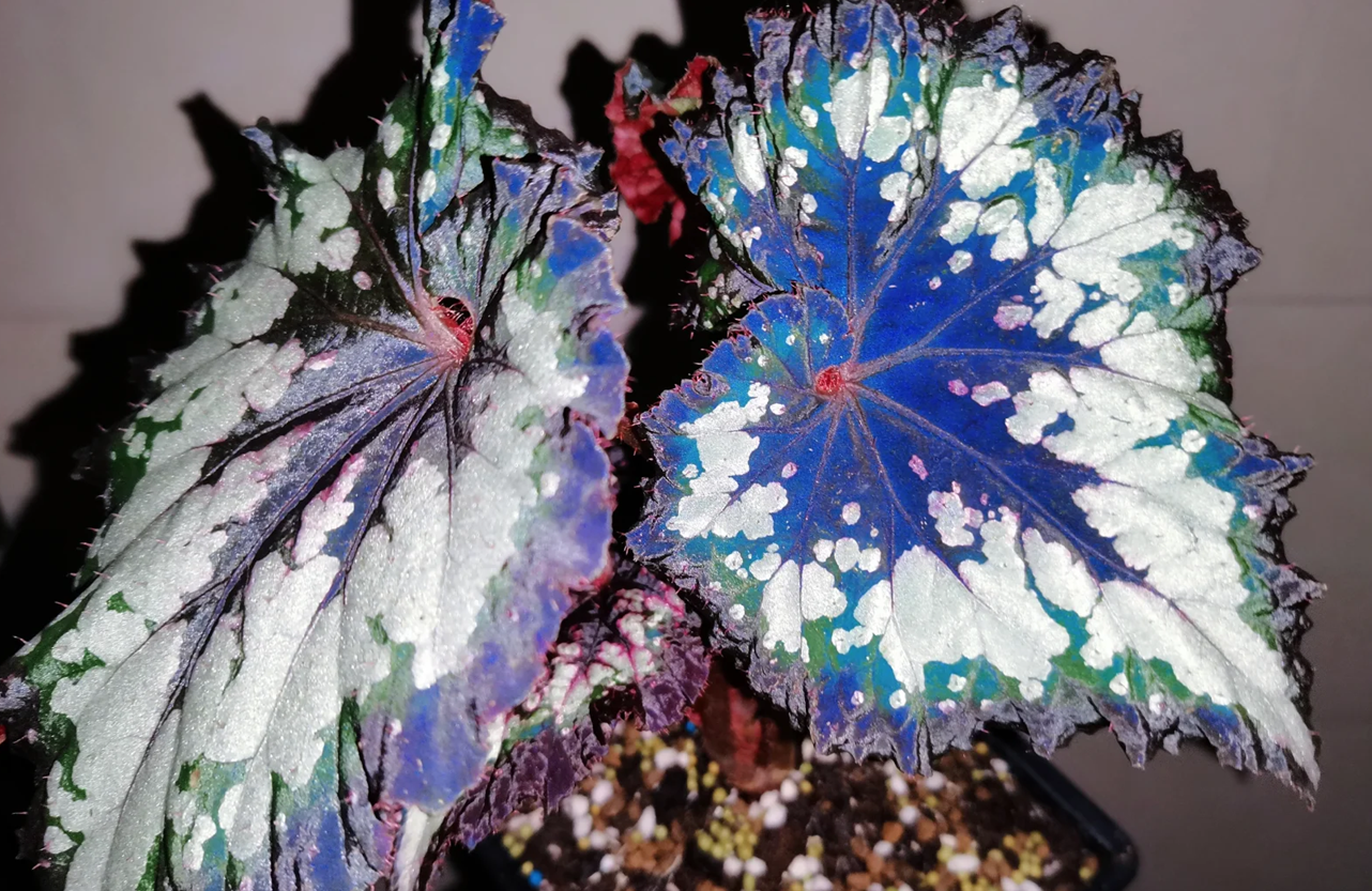 Each Christmas Carnival begonia seed is different from one leaf to another, and the leaves can grow huge. A deep blue like ocean-colored satin, with dense silver spots and bursts of contrasting colors.