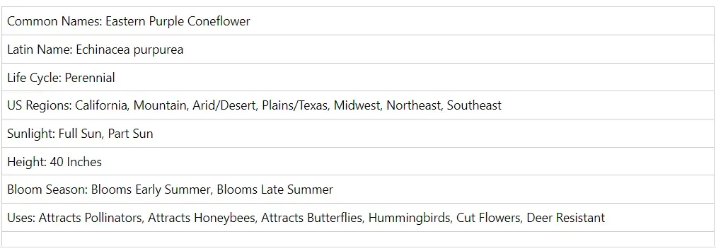Growing: Water seedlings until they become established. Unlike most coneflowers, Purple Coneflower does not do well in drought conditions and needs adequate moisture. The area should be well-drained to avoid soggy soil, since this can cause disease. Keep competition to a minimum in the first year of growth, since this plant cannot reach its full potential when crowded by weeds. After several years of growth, mature plants can be divided in late fall. This Purple Coneflower plant attracts hummingbirds, butterflies and bees.