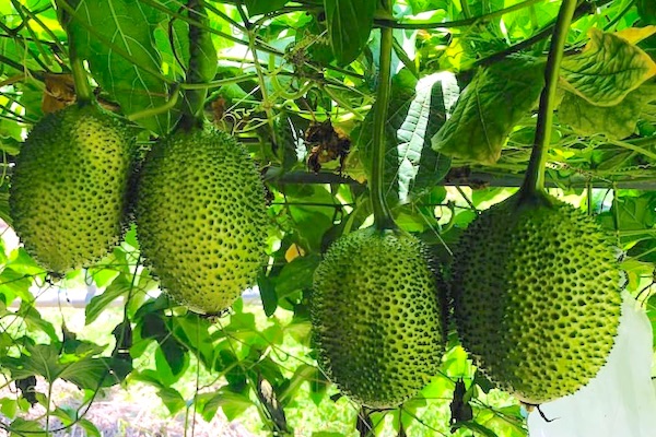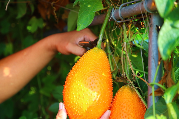 Gac grows on vines and is usually collected from fence climbers or from wild plants. The fruit itself becomes a dark orange color upon ripening, and is typically round or oblong, maturing to a size of about 13 cm in length and 10 cm in diameter.